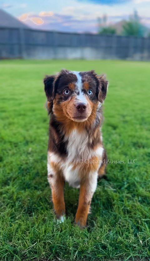 Introducing our captivating Harlequin Merle girl, Wren – a true delight in every sense! With boundless energy and an infectious zest for life, she never fails to bring joy to everyone she meets. Wren is the epitome of happiness and exudes an irresistible charm that instantly wins hearts. Not only is she visually stunning, but Wren's playful quirks and endearing antics are guaranteed to bring a smile to your face. Her unique personality adds an extra layer of charm, making every moment spent with her truly unforgettable. In fact, Wren is so exceptional that if it were possible, we'd have an entire pack of Aussies just like her! She's simply perfect in every way and a cherished member of our family.